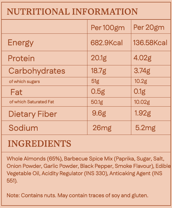 Whole Almonds (65%), Barbecue Spice Mix (Paprika, Sugar, Salt, Onion Powder, Garlic Powder, Black Pepper, Smoke Flavour), Edible Vegetable Oil, Acidity Regulator (INS 330), Anticaking Agent (INS 551).