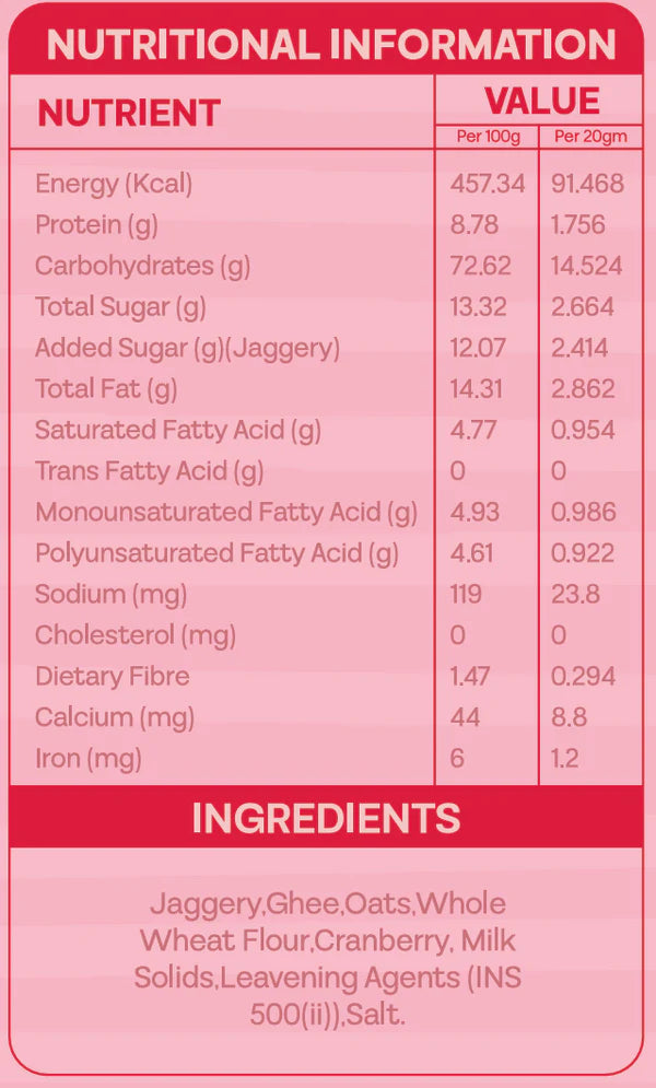 Jaggery, Butter, Whole Wheat Flour, Oats, Cranberry, Milk, Oats Flour