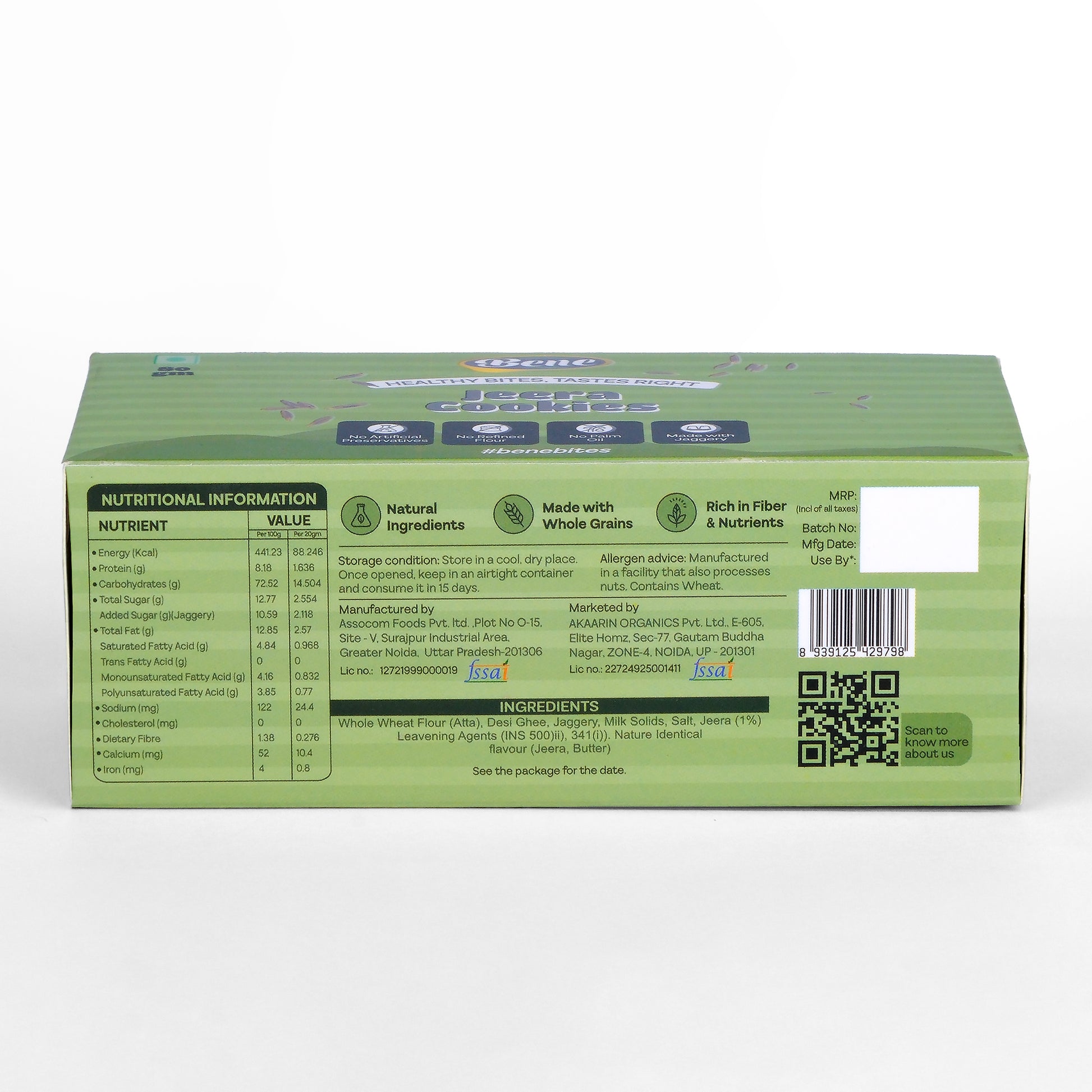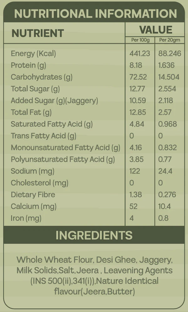 Whole Wheat Flour, Coconut Oil, Jaggery, Jeera.