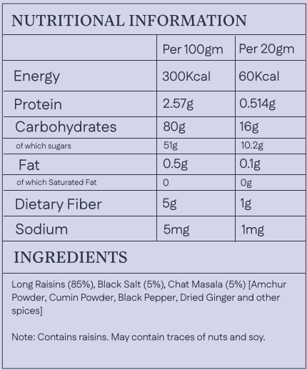Long Raisins (85%), Black Salt (5%), Chat Masala (5%) [Amchur Powder, Cumin Powder, Black Pepper, Dried Ginger and other spices]